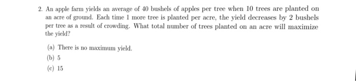 Here is all you need to know about an apple farm yields an average of 40 bushels Calculus questions and answers. Each time 1 moretree is planted per acre the yield decreases 1 bu per tree due tothe extra congestion. An apple farm yields an average of 39 bushels of apples per tree when 19 trees are planted on an acre of ground. An apple farm yields an average of 32 bushels of chegg apple farm word problem solved an apple farm yields an average of 30 bushels of apples per tree when 20 trees are planted on an acre of ground an apple orchard has an average yield of 40 bushels chegg an apple farm yields an average of 32 bushels of chegg solved an apple farm yields an average of 30 bushels of apples per tree when 20 trees are planted on an acre of ground calculus 1 max min problems 14 of 30 maximizing apple orchard production solved an apple farm yields an average of 30 bushels of apples per tree when 20 trees are planted on an acre of ground Each time 1 more tree is planted per acre the yield decreases by 1 bushel bu per tree as a result of crowding.